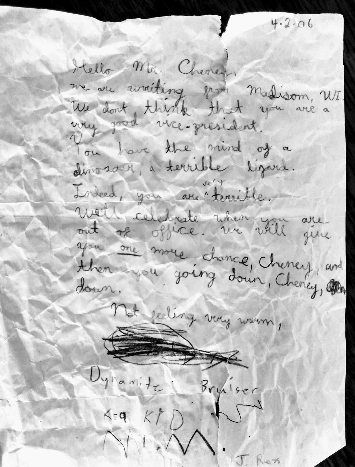 As a post-script, in the spirit of the delights that keep us moving forward, I submit this cutting missive to Dick Cheney, penned by my siblings, friends, and me (aged 9), which reads, in part:
